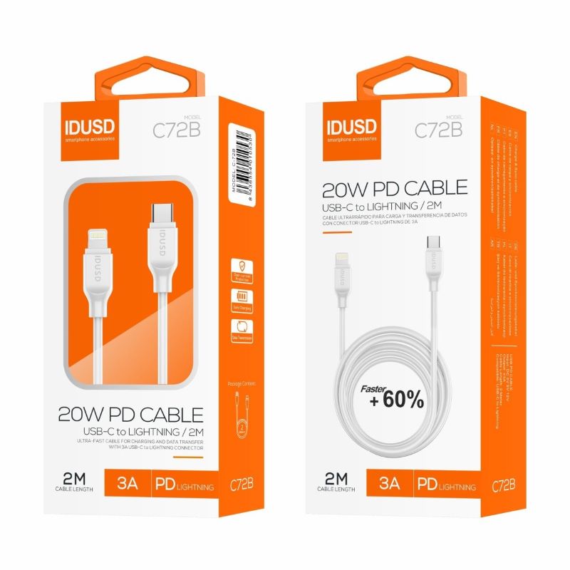 Compatível com carregadores PD, como o PD3.0 CHARGER IDUSD (Ref: D60B), o Cabo PD Type-C para Lightning 2M 3A é o acessório perfeito para manter seus dispositivos Apple sempre carregados e sincronizados.