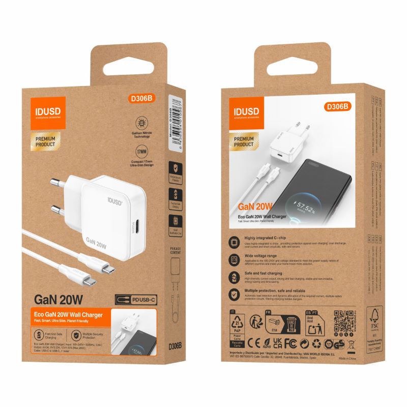 Comprometidos com o meio ambiente, desenvolvemos a embalagem do Carregador GaN PD20W 1C – PD USB-C com materiais certificados pelo FSC, garantindo práticas florestais responsáveis e sustentáveis. Este carregador combina inovação, potência e responsabilidade ecológica, tornando-se o aliado perfeito para um estilo de vida moderno e consciente.