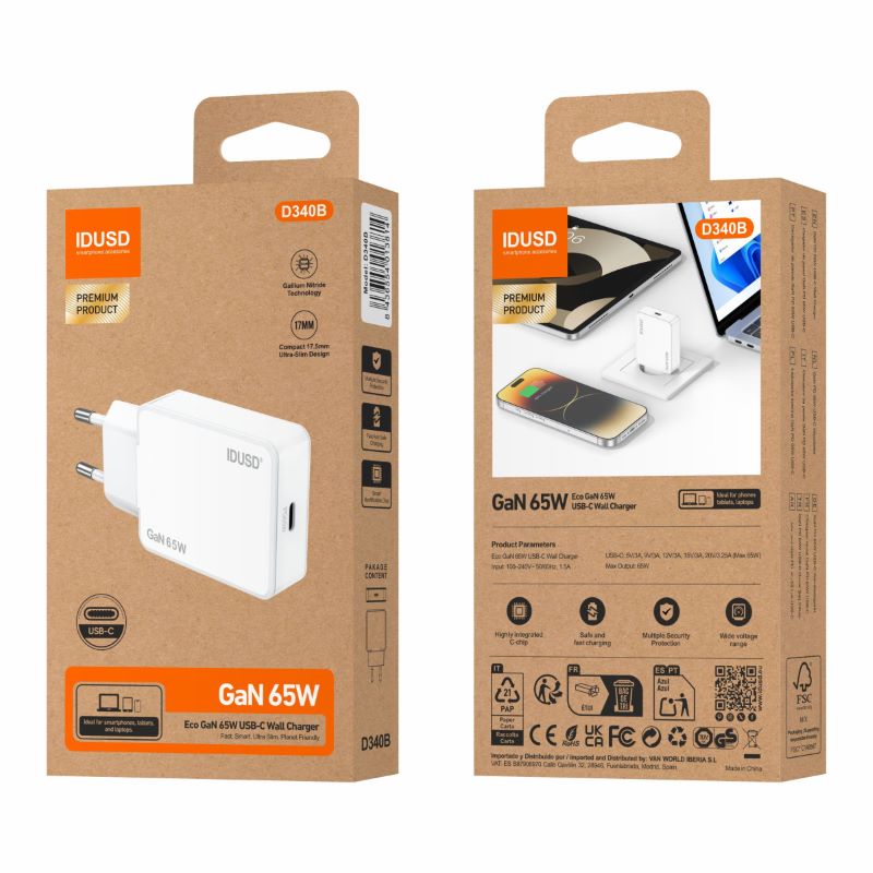 O Carregador GaN PD65W 1C é a escolha ideal para quem procura potência profissional num carregador ultrafino, fiável e portátil.