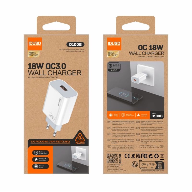 O compromisso com o meio ambiente também é uma prioridade: o Eco Carregador QC 18W faz parte da série ECO da IDUSD, com embalagem 100% reciclável e livre de plástico, minimizando o impacto ambiental.