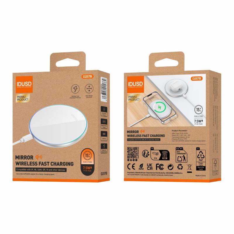 O Eco Wireless Charger D257B é um carregador sem fio com certificação Qi de 15W, projetado para fornecer carregamento rápido, seguro e eficiente. Compatível com Apple, Samsung, Xiaomi, VIVO, OPPO e todos os dispositivos com tecnologia Qi, incluindo Apple Watch e fones de ouvido sem fio. Seu design ultrafino com superfície com acabamento espelhado o torna um acessório elegante e moderno, ideal tanto para o escritório quanto para casa.